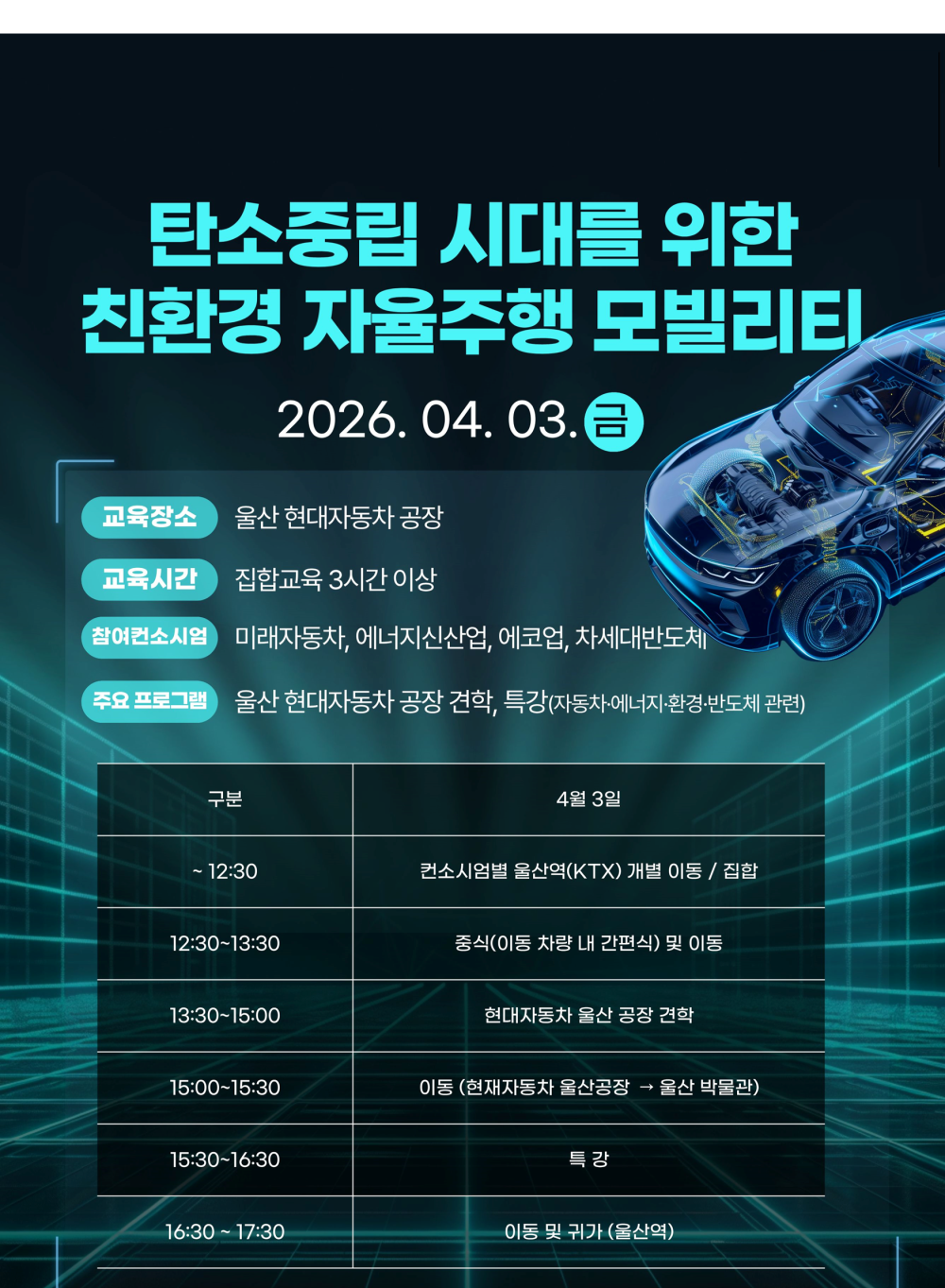 비교과 [마감]2026 미래자동차 현장 견학 프로그램(울산 현대자동차 공장 견학 및 특강) 신청 안내(~3/18 13시까지)