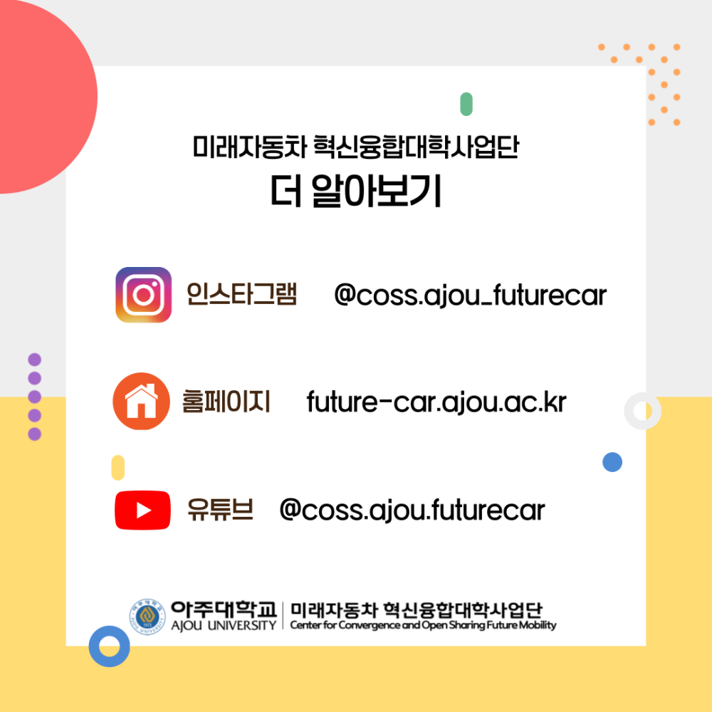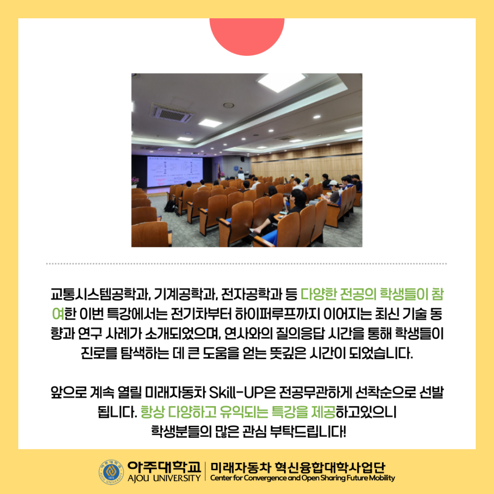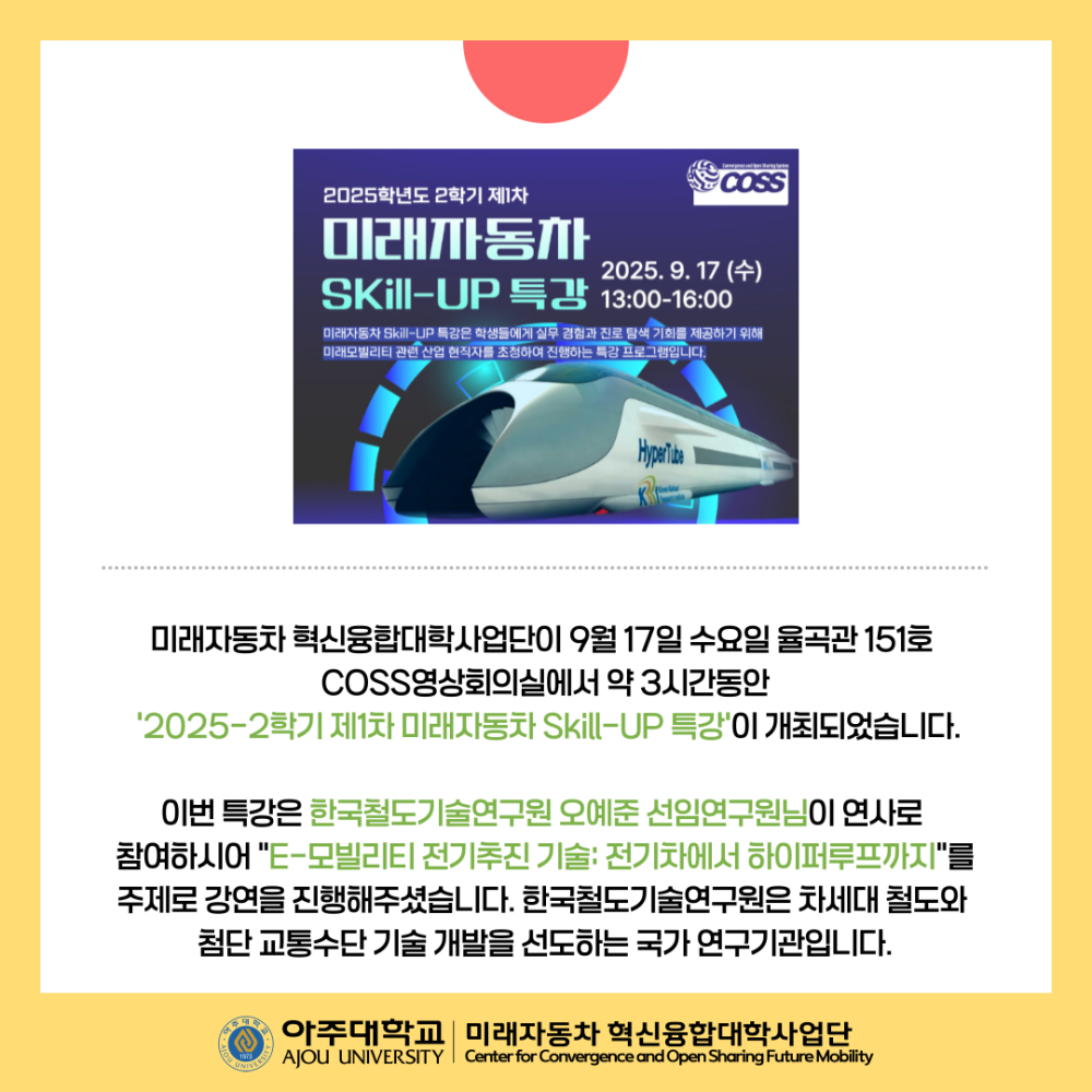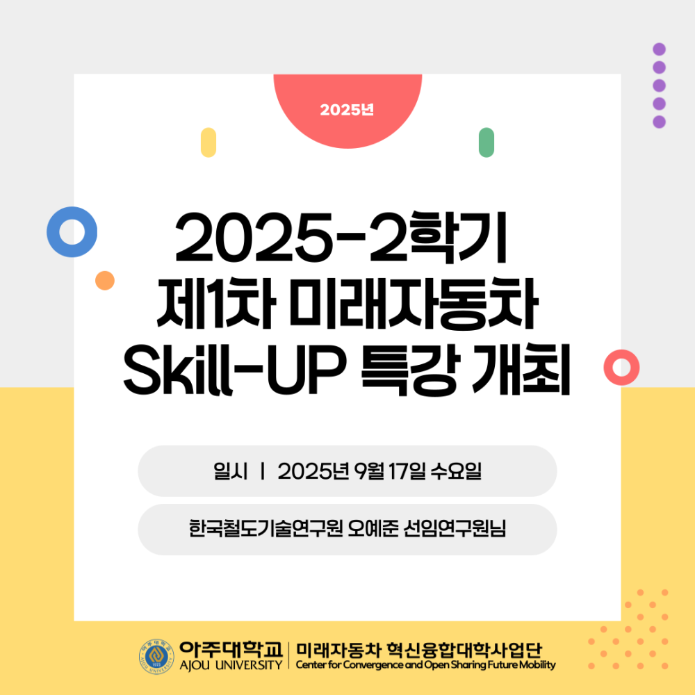 카드뉴스 2025-2학기 제1차 미래자동차 Skill-UP 특강 현장 스케치! ✨ 페이지 정보 작성자 미래자동차 댓글 0건 조회 8회 작성일 25-11-04 09:46 본문 목록 이전글제 2회 CO-SHOW 개최 안내 (11.26~29, 부산 벡스코) 25.11.04 다음글아주대학교 교통시스템공학과 학부생팀, 제3회 대도시권 광역교통혁신 공모전 ‘최우수상’ 수상! 25.10.16 댓글목록 댓글목록 등록된 댓글이 없습니다.