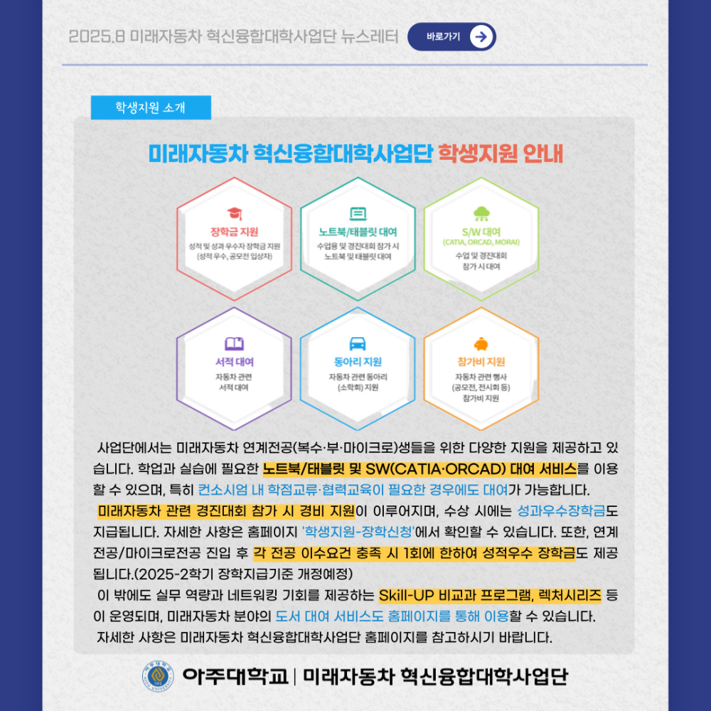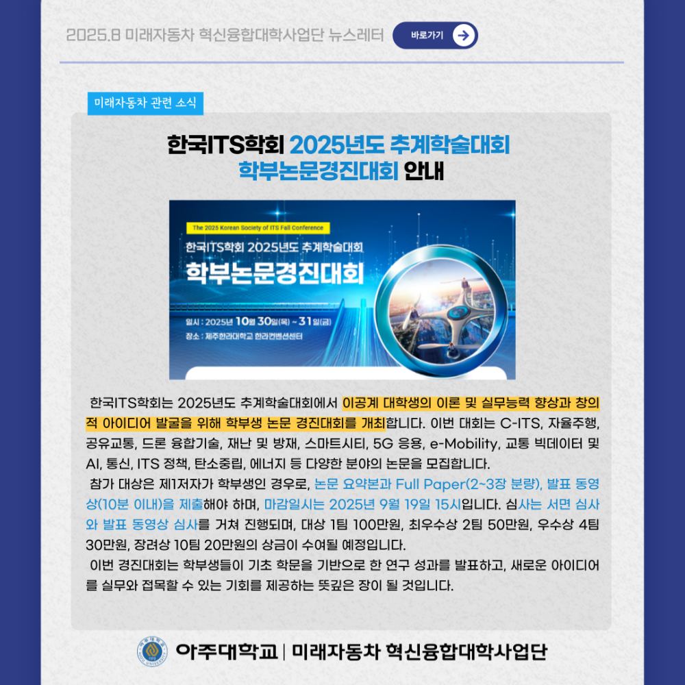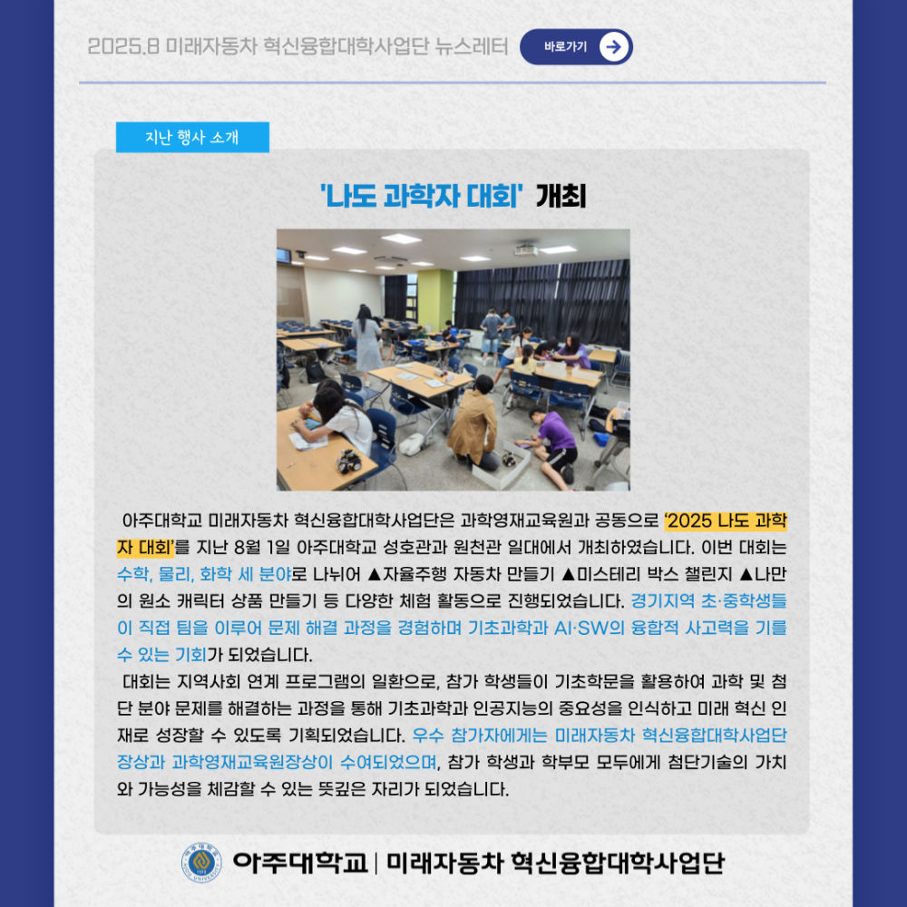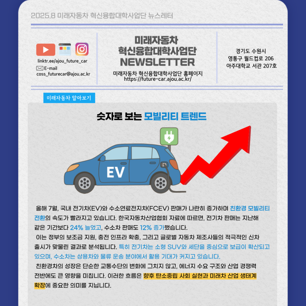 뉴스레터 2025년 8월 뉴스레터 페이지 정보 작성자 미래자동차 댓글 0건 조회 15회 작성일 25-11-05 09:16 본문 목록 이전글2025년 10월 뉴스레터 25.11.05 다음글미래자동차 비교과 프로그램 소개 25.11.05 댓글목록 댓글목록 등록된 댓글이 없습니다.