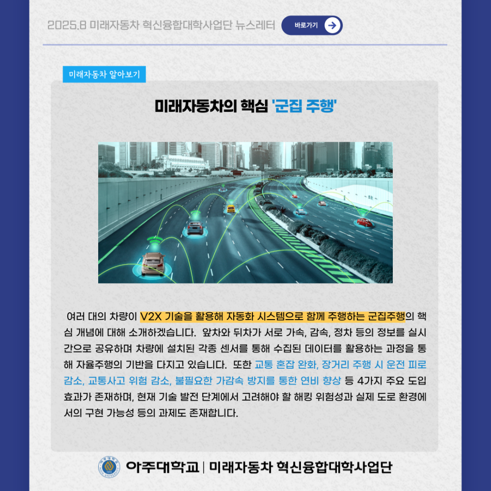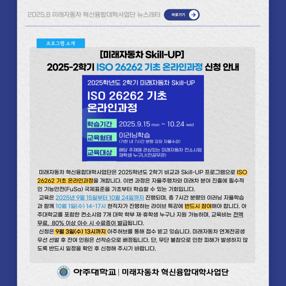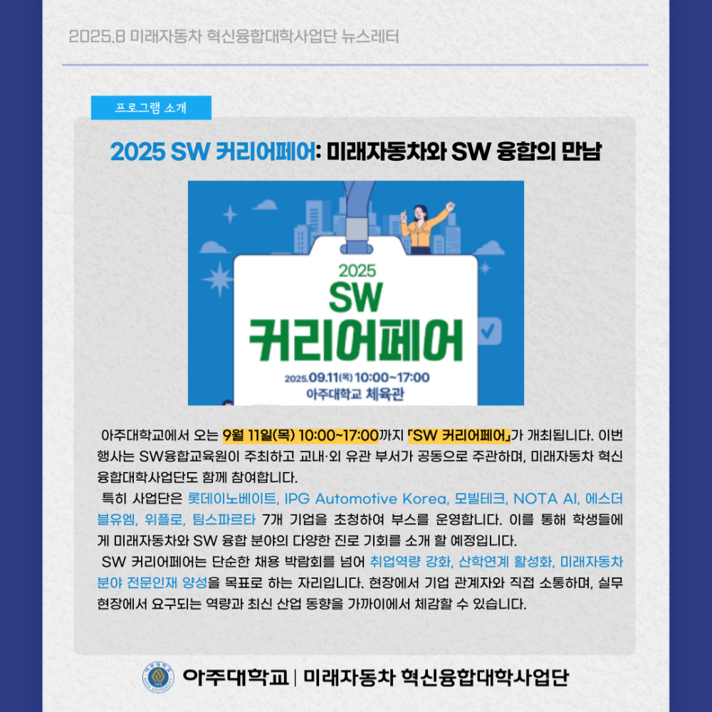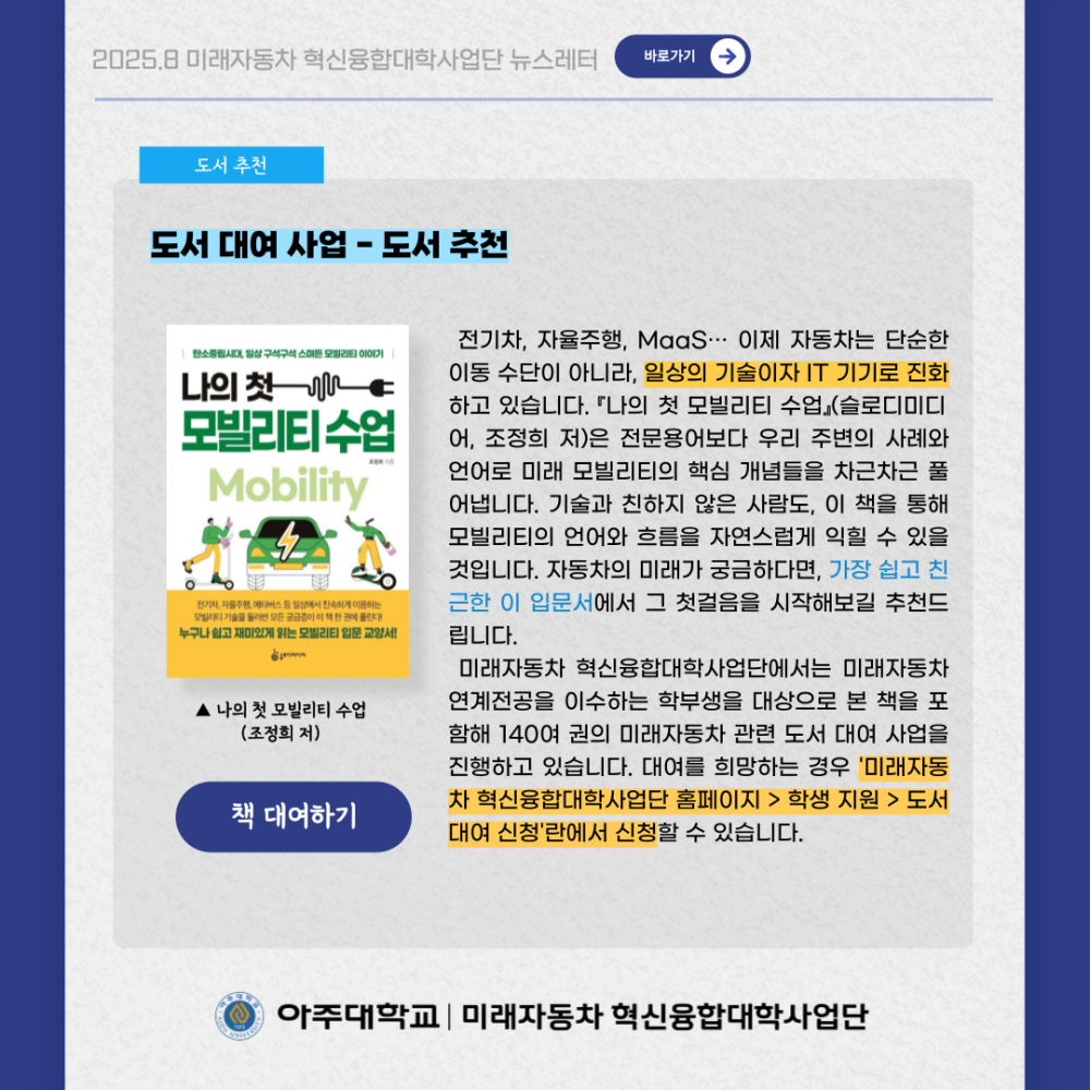 뉴스레터 2025년 8월 뉴스레터 페이지 정보 작성자 미래자동차 댓글 0건 조회 15회 작성일 25-11-05 09:16 본문 목록 이전글2025년 10월 뉴스레터 25.11.05 다음글미래자동차 비교과 프로그램 소개 25.11.05 댓글목록 댓글목록 등록된 댓글이 없습니다.