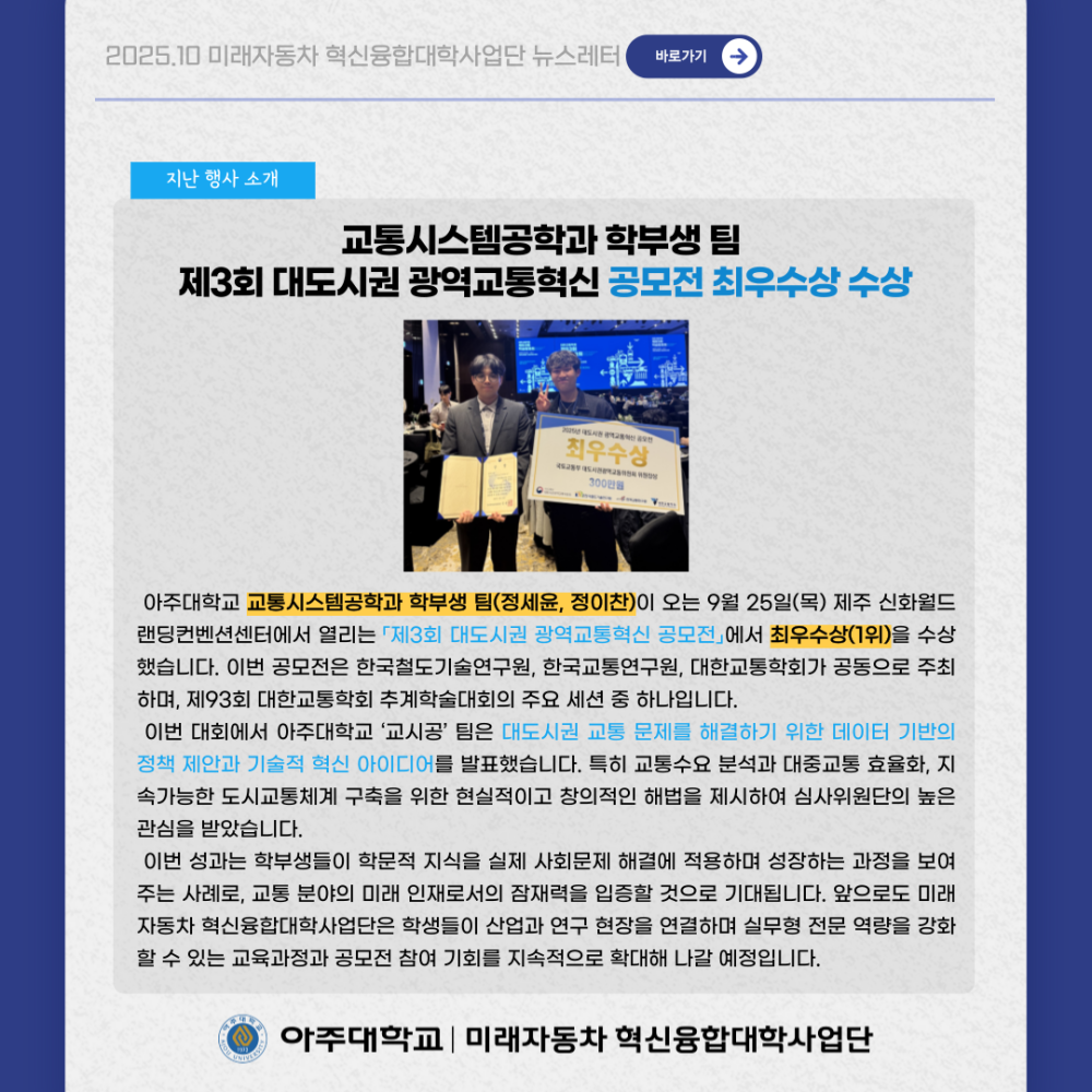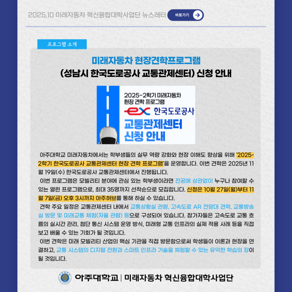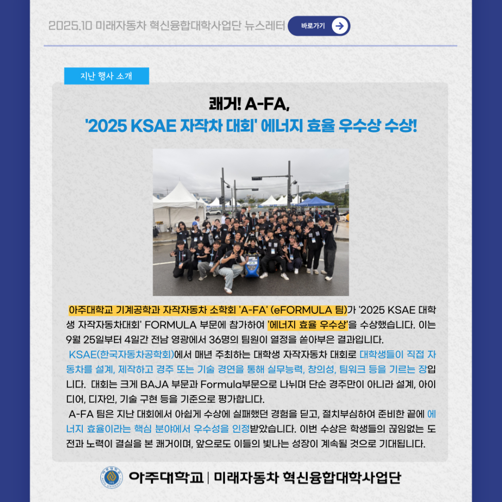 뉴스레터 2025년 10월 뉴스레터 페이지 정보 작성자 미래자동차 댓글 0건 조회 19회 작성일 25-11-05 09:17 본문 목록 이전글2025 대학생 창작 모빌리티 경진대회 무인 모빌리티 부분 대회 참가 소식 25.11.07 다음글2025년 8월 뉴스레터 25.11.05 댓글목록 댓글목록 등록된 댓글이 없습니다.