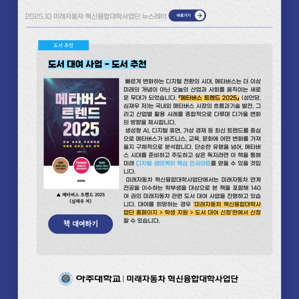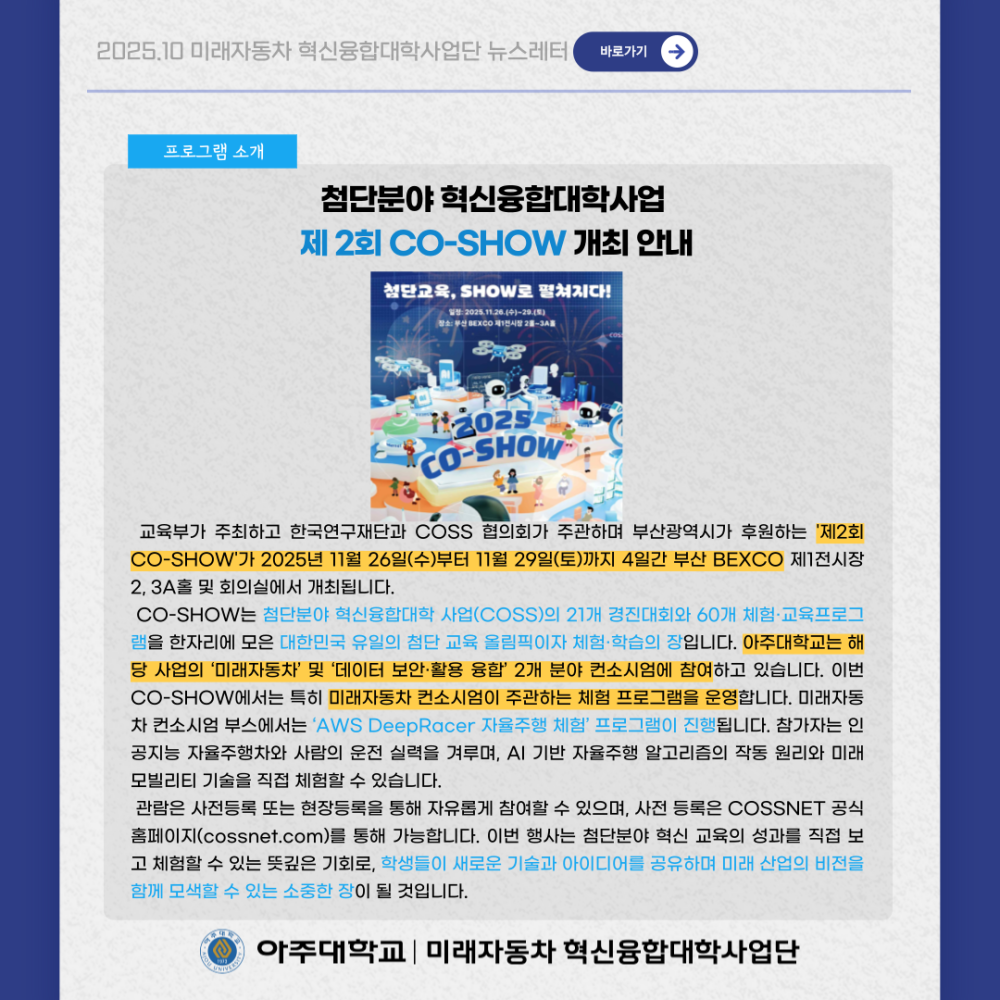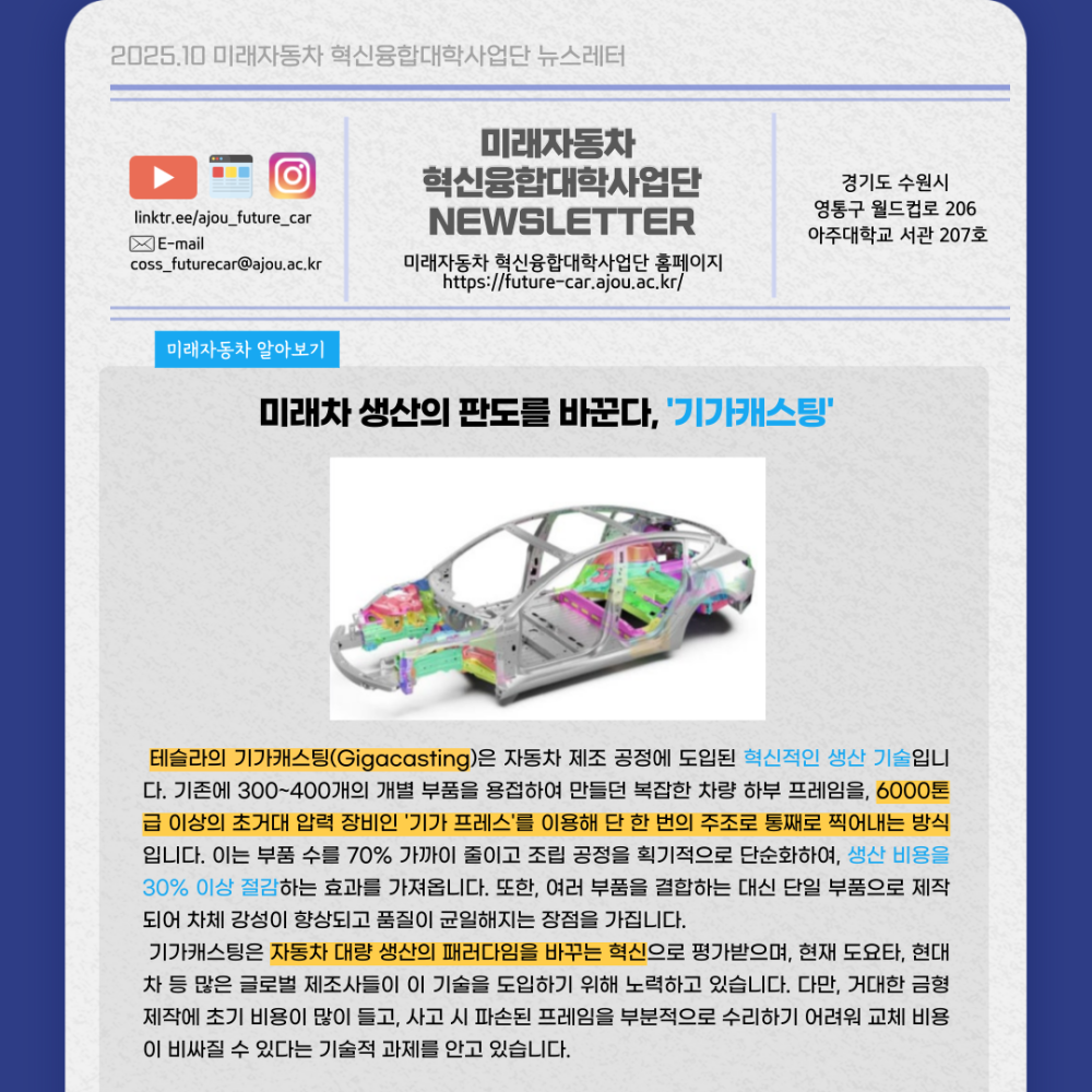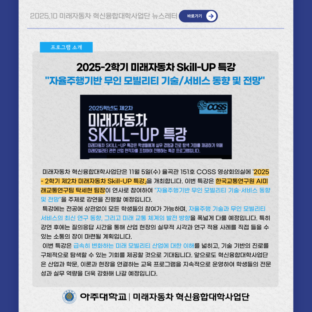 뉴스레터 2025년 10월 뉴스레터 페이지 정보 작성자 미래자동차 댓글 0건 조회 19회 작성일 25-11-05 09:17 본문 목록 이전글2025 대학생 창작 모빌리티 경진대회 무인 모빌리티 부분 대회 참가 소식 25.11.07 다음글2025년 8월 뉴스레터 25.11.05 댓글목록 댓글목록 등록된 댓글이 없습니다.