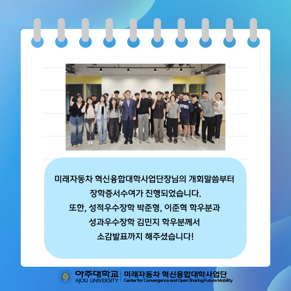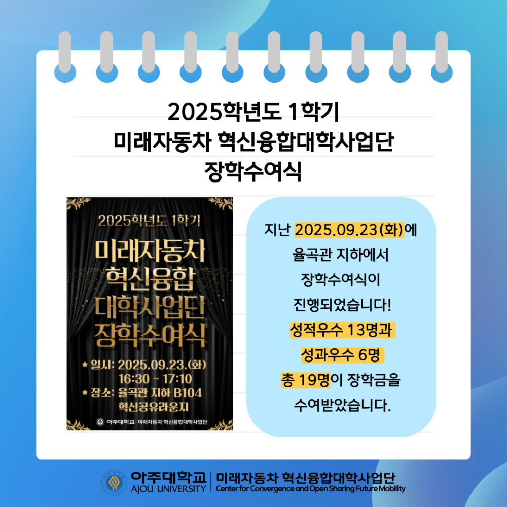 카드뉴스 2025학년도 1학기 장학수여식이 개최 페이지 정보 작성자 미래자동차 댓글 0건 조회 28회 작성일 25-10-14 11:51 본문 목록 이전글✨ 2025 SW커리어페어 ✨ 25.10.14 다음글혁신융합대학 사업단 지원 사업들을 알려드립니다!! 25.09.30 댓글목록 댓글목록 등록된 댓글이 없습니다.