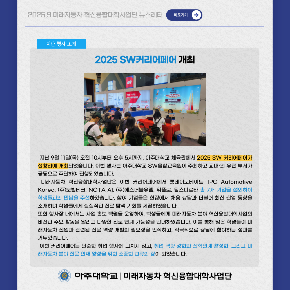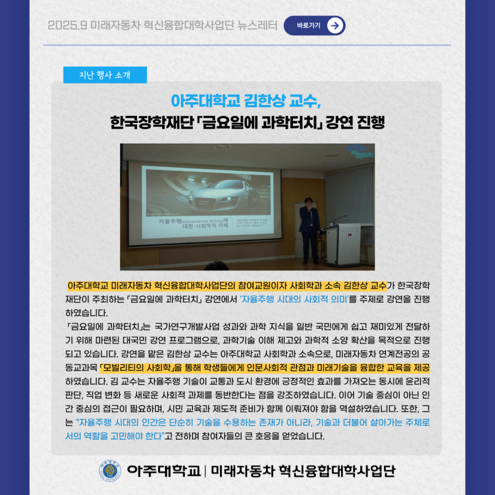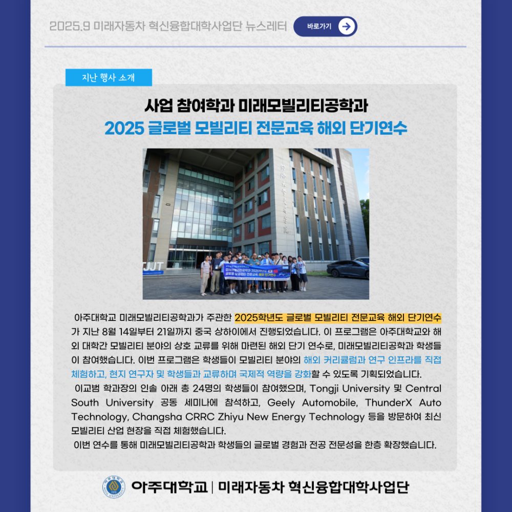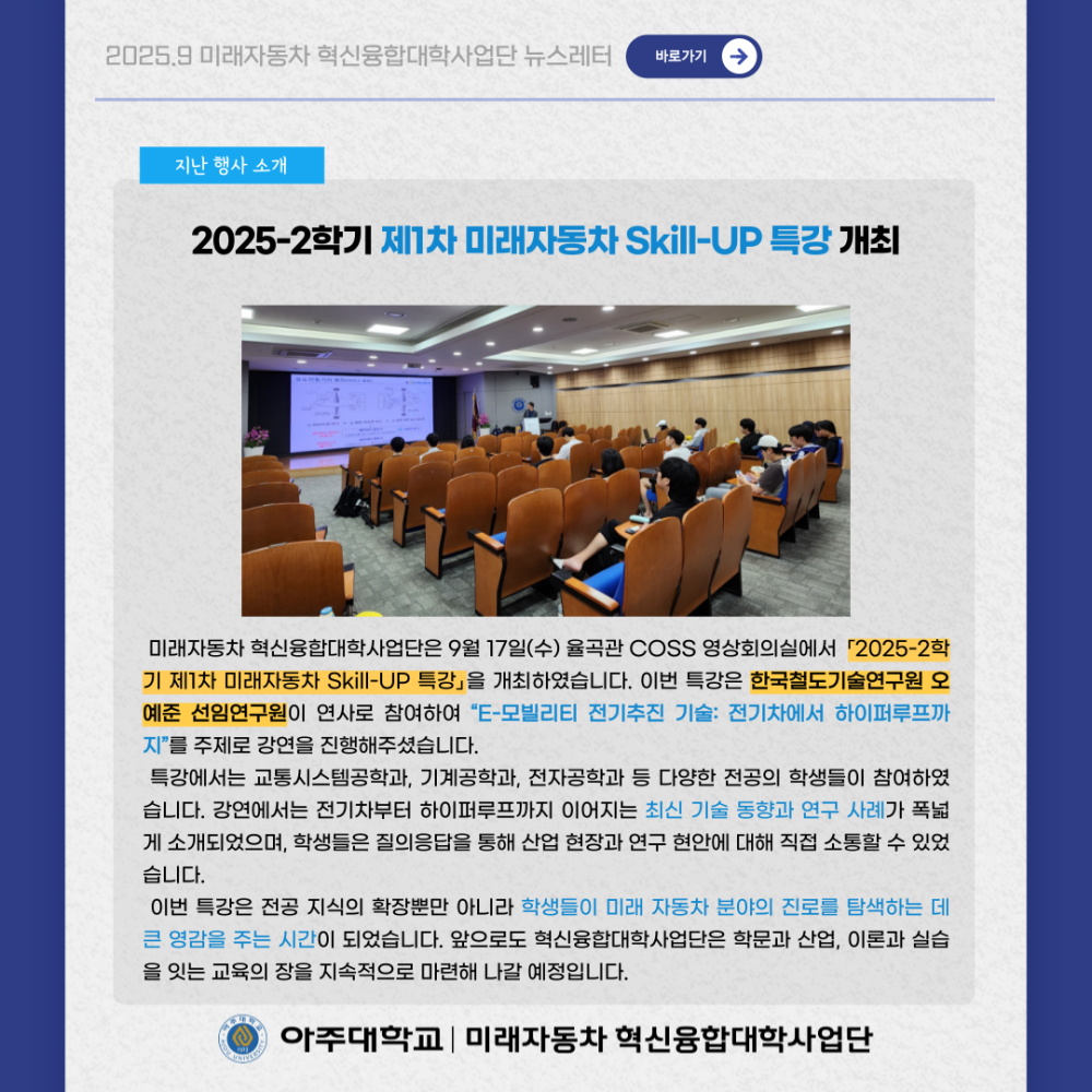 뉴스레터 2025년 9월 뉴스레터 페이지 정보 작성자 미래자동차 댓글 0건 조회 37회 작성일 25-10-14 11:53 본문 목록 이전글아주대학교 교통시스템공학과 학부생팀, 제3회 대도시권 광역교통혁신 공모전 ‘최우수상’ 수상! 25.10.16 다음글아주대학교 미래모빌리티공학과, 글로벌 무대로 나아가다! 25.10.14 댓글목록 댓글목록 등록된 댓글이 없습니다.