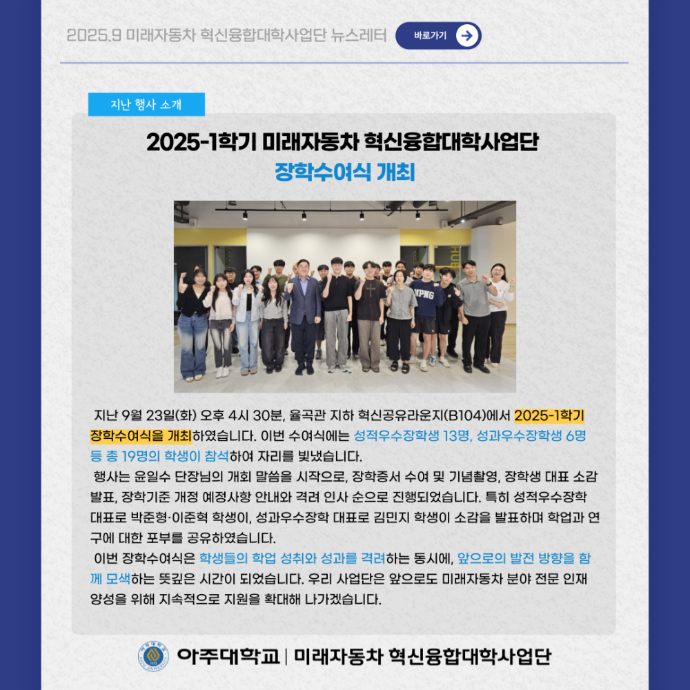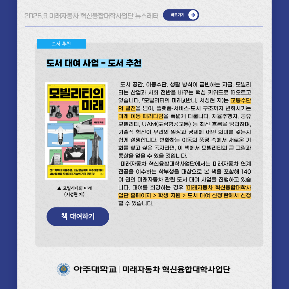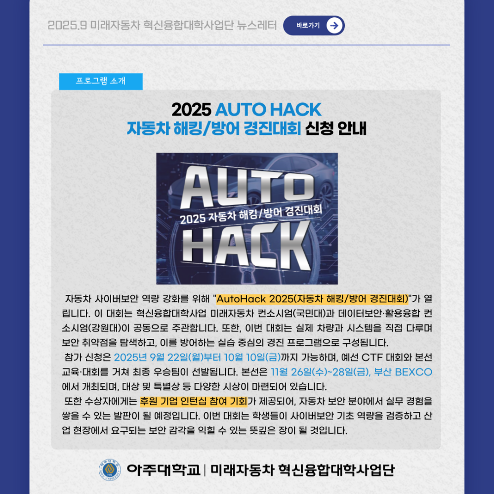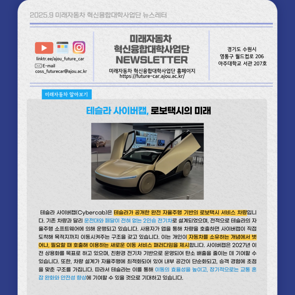 뉴스레터 2025년 9월 뉴스레터 페이지 정보 작성자 미래자동차 댓글 0건 조회 37회 작성일 25-10-14 11:53 본문 목록 이전글아주대학교 교통시스템공학과 학부생팀, 제3회 대도시권 광역교통혁신 공모전 ‘최우수상’ 수상! 25.10.16 다음글아주대학교 미래모빌리티공학과, 글로벌 무대로 나아가다! 25.10.14 댓글목록 댓글목록 등록된 댓글이 없습니다.