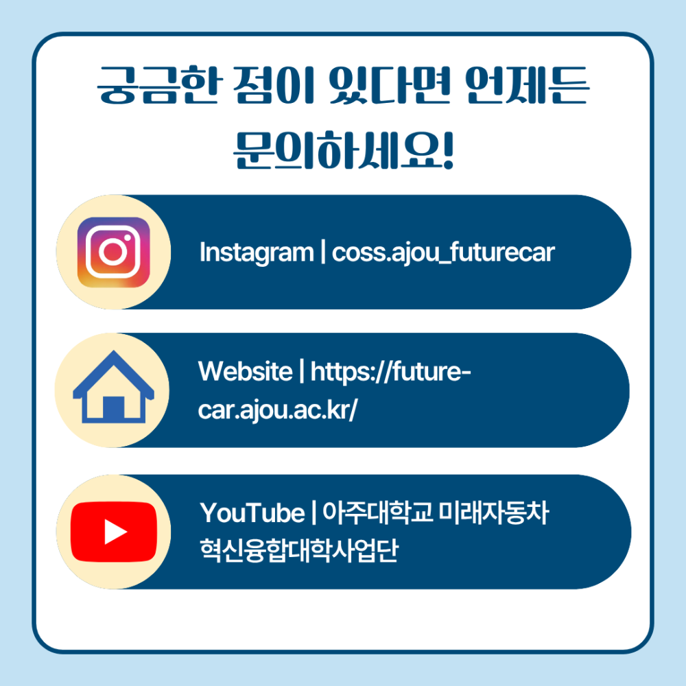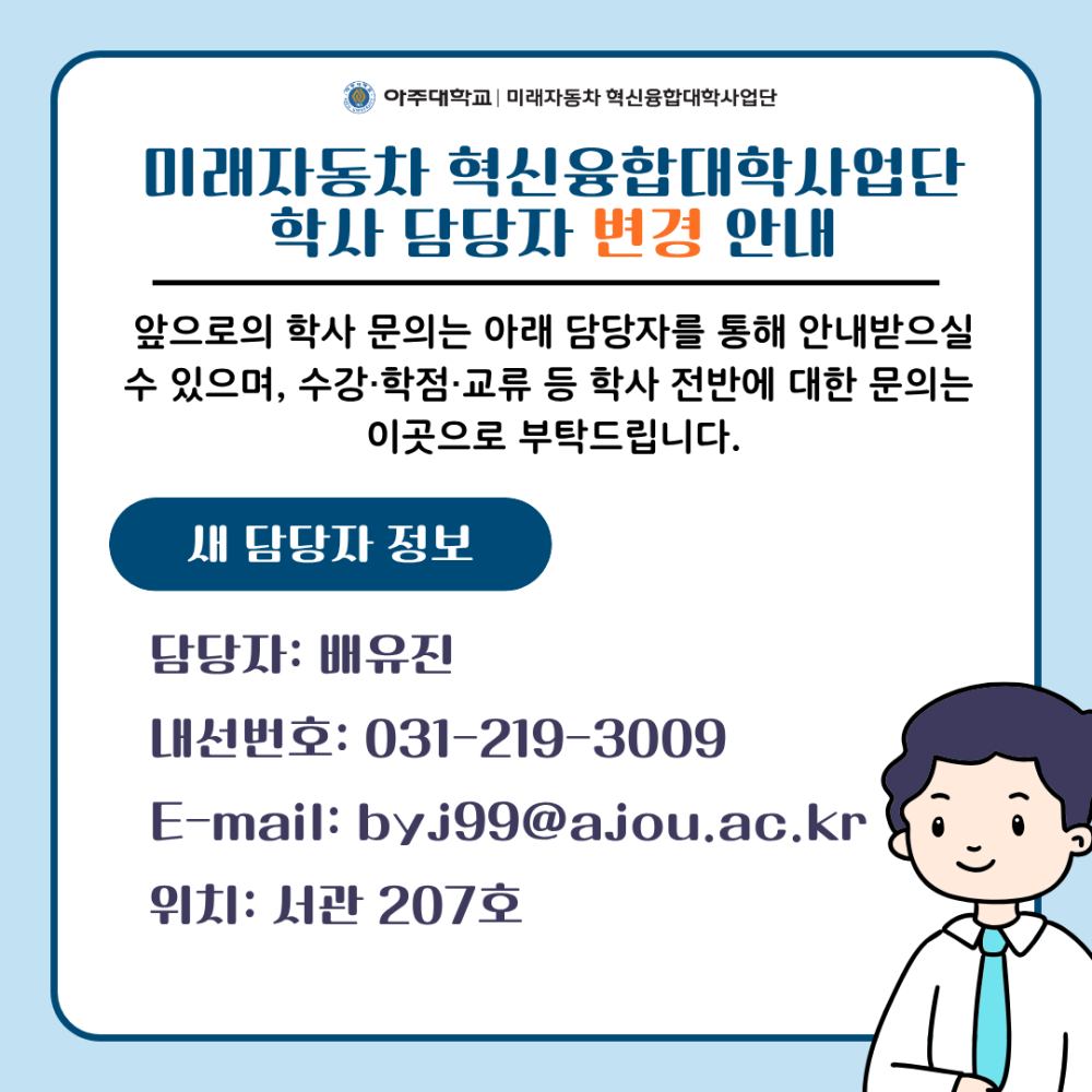 공지 학사담당자 변경 안내 페이지 정보 작성자 미래자동차 댓글 0건 조회 46회 작성일 25-11-28 11:06 본문 목록 이전글요즘 뜨는 미래자동차 이슈, 한눈에 보기 ! 25.11.28 다음글2025 동계계절학기 COSS 학점교류(OUT) 안내! 25.11.28 댓글목록 댓글목록 등록된 댓글이 없습니다.