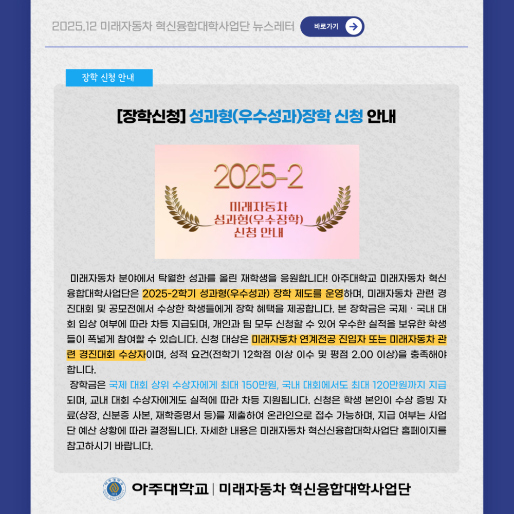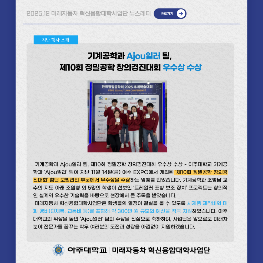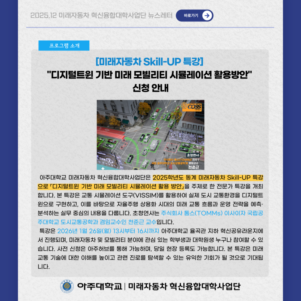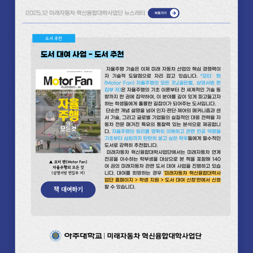 뉴스레터 2025년 12월 뉴스레터 페이지 정보 작성자 미래자동차 댓글 0건 조회 102회 작성일 26-01-02 09:14 본문 목록 이전글기아자동차 국내 최초 일반도로 원격 운전 1,000km 성공 26.01.02 다음글2025년 11월 뉴스레터 25.12.02 댓글목록 댓글목록 등록된 댓글이 없습니다.