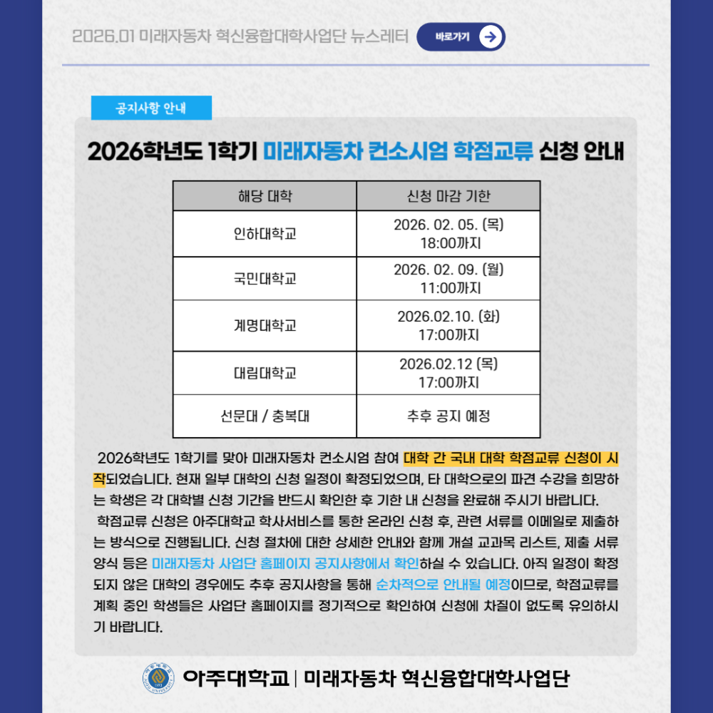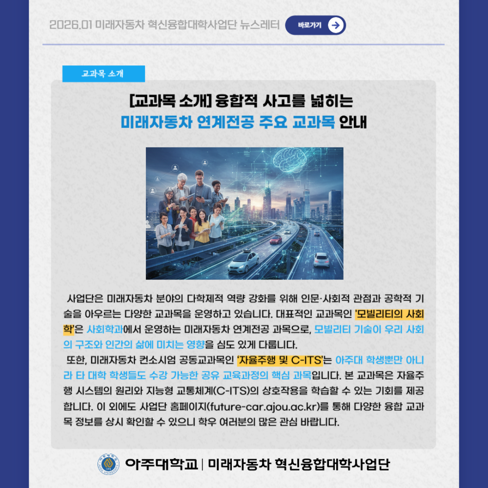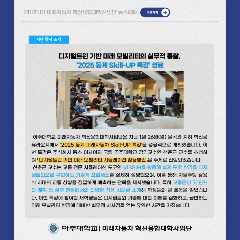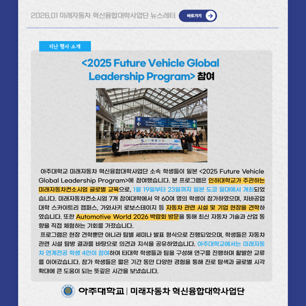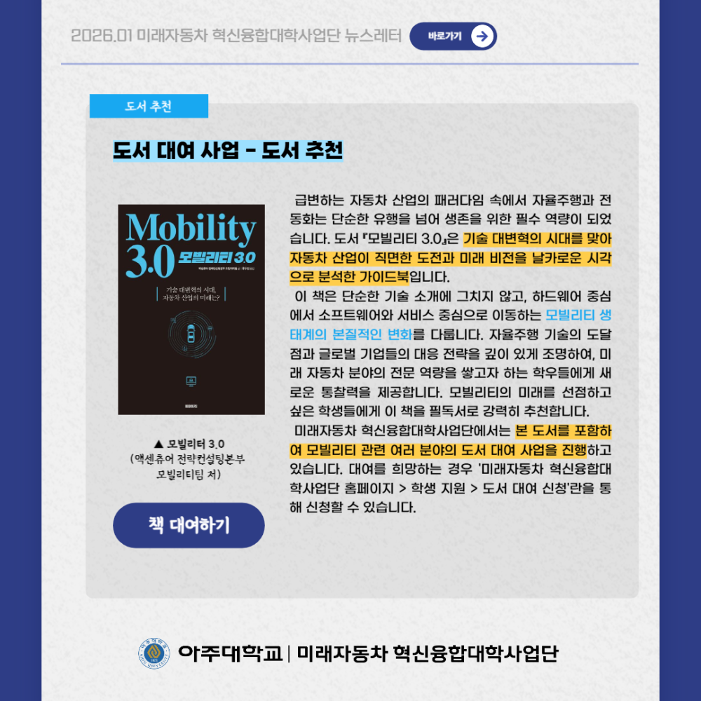 뉴스레터 2026년 1월 뉴스레터 페이지 정보 작성자 미래자동차 댓글 0건 조회 28회 작성일 26-02-05 13:18 본문 목록 다음글평행주차 종결 기술 26.01.05 댓글목록 댓글목록 등록된 댓글이 없습니다.