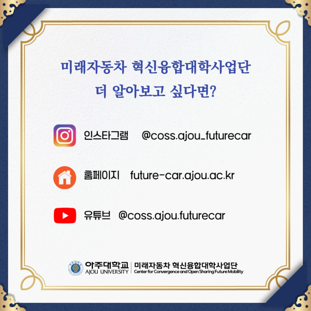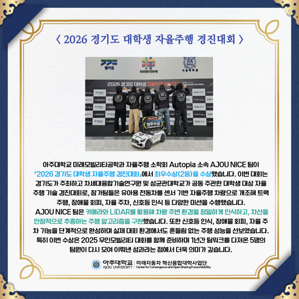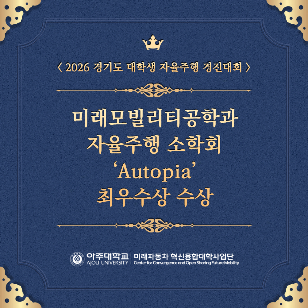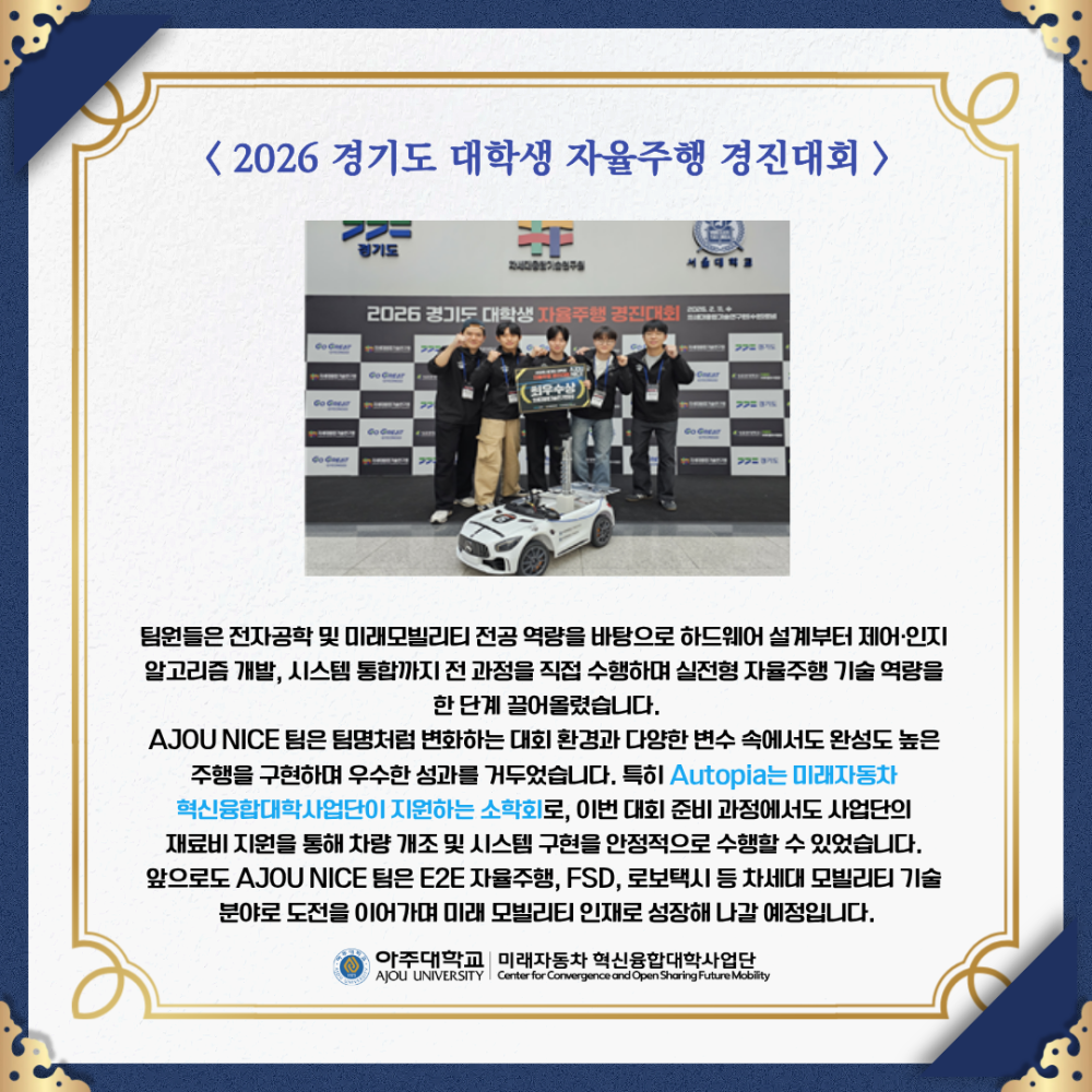 카드뉴스 AJOU NICE, 최우수상 수상! 페이지 정보 작성자 미래자동차 댓글 0건 조회 62회 작성일 26-03-10 15:32 본문 목록 이전글2025 AWS DeepRacer 챔피언십 리그 26.03.10 다음글미래차 연계전공 추천 과목: 모빌리티의 사회학 26.03.10 댓글목록 댓글목록 등록된 댓글이 없습니다.