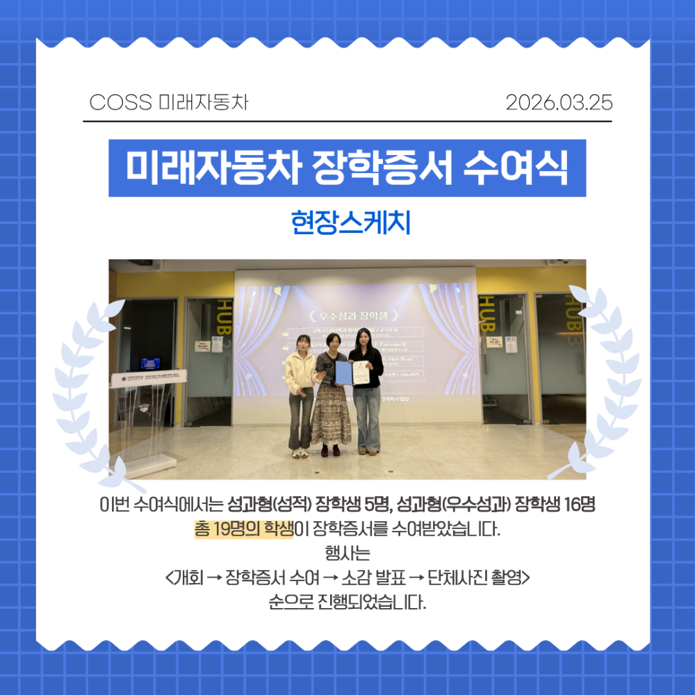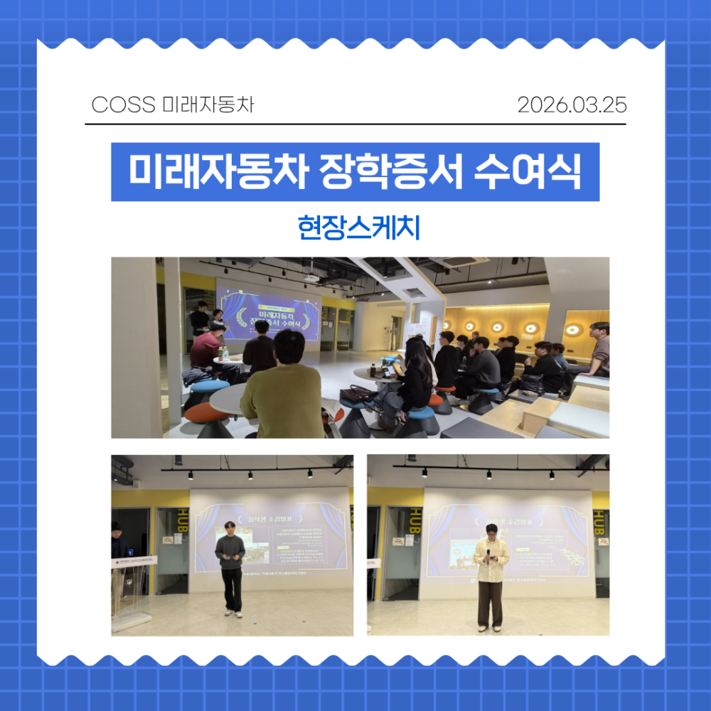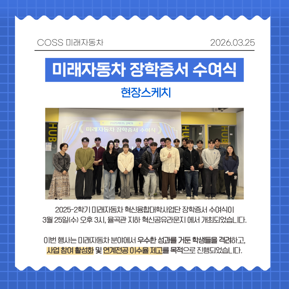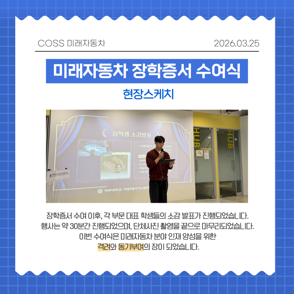 카드뉴스 2025-2학기 미래자동차 장학증서 수여식 페이지 정보 작성자 미래자동차 댓글 0건 조회 26회 작성일 26-04-01 10:43 본문 목록 이전글2026 대학생 자작자동차대회 Baja부문 26.04.09 다음글[모집] 아주대 미래차 사업단과 함께 성장할 ‘5기 서포터즈’를 찾습니다! 26.03.10 댓글목록 댓글목록 등록된 댓글이 없습니다.
